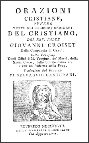 | Orazioni cristiane, ovvero tutti gli esercizj ordinarj del cristiano, del rev. padre Giovanni Croiset della Compagnia di Gesù: colla parafrasi degli uffizj di M. Vergine, de' morti, della santa croce, dello Spirito Santo ec. e con un ristretto della fede. Traduzione dal francese di Selvaggio Canturani |