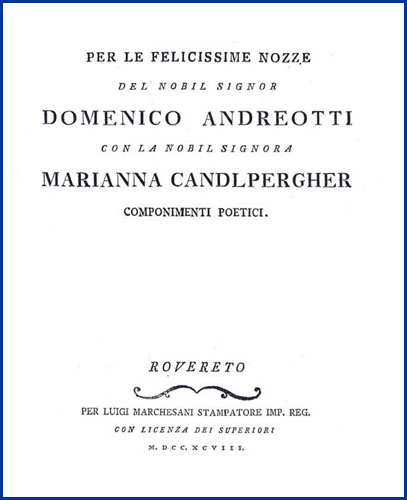 | Per le felicissime nozze del nobil signor Domenico Andreotti con la nobil signora Marianna Candlpergher. Componimenti poetici |