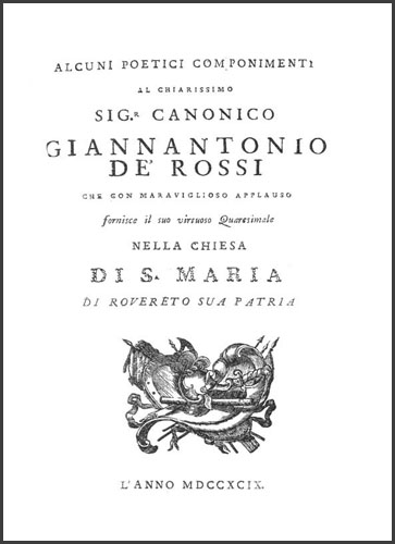 | Alcuni poetici componimenti al chiarissimo sig.r canonico Giannantonio de' Rossi che con maraviglioso applauso fornisce il suo virtuoso quaresimale nella chiesa di S. Maria di Rovereto sua patria |