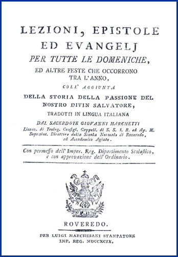 | Lezioni, epistole ed evangelj per tutte le domeniche, ed altre feste che occorrono tra l'anno, coll'aggiunta della storia della passione del nostro divin salvatore, tradotti in lingua italiana dal sacerdote Giovanni Marchetti licenz. di teolog. consigl. cappell. di s.s.i.r. ed ap. m. sopraint. direttore della scuola normale di Roveredo, ed Accademico Agiato |