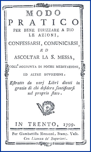 | Modo pratico per bene dirizzare a Dio le azioni, confessarsi, comunicarsi, ed ascoltar la s. messa, coll'aggiunta di poche meditazioni, ed altre divozioni. Estratto da varj libri divoti in grazia di chi desidera santificarsi nel proprio stato |