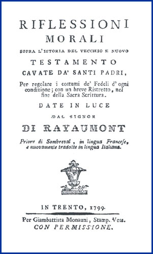 | Riflessioni morali sopra l'istoria del Vecchio e Nuovo Testamento cavate da' santi padri, per regolare i costumi de' fedeli d'ogni condizione; con un breve ristretto, nel fine della Sacra Scrittura. Date in luce dal signor di Rayaumont priore di Sombreval, in lingua francese, e nuovamente tradotte in lingua italiana |