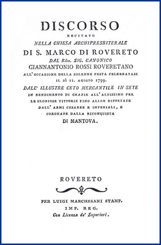 | Discorso recitato nella chiesa archipresbiterale di S. Marco di Rovereto dal reverendissimo sig. canonico Giannantonio Rossi roveretano all'occasione della solenne festa celebratasi il dì 11. agosto 1799. dall'illustre ceto mercantile in sete in rendimento di grazie all'altissimo per le gloriose vittorie fino allor riportate dall'armi cesaree e imperiali, e coronate dalla riconquista di Mantova |