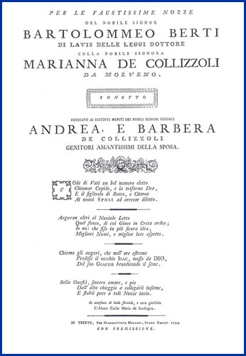 | Per le faustissime nozze del nobile signor Bartolommeo Berti di Lavis delle leggi dottore colla nobile signora Marianna de Collizzoli da Molveno. Sonetto |