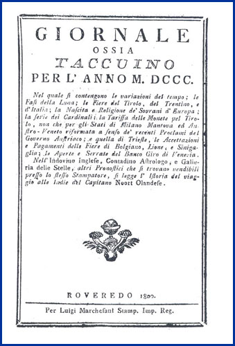 | Giornale ossia taccuino per l'anno M.DCCC. nel quale si contengono le variazioni del tempo; le fasi della luna; le fiere del Tirolo, del Trentino, e d'Italia; la nascita e religione de' sovrani d'Europa; la serie dei cardinali; la tariffa delle monete pel Tirolo, non che per gli stati di Milano Mantova ed Austro-Veneto riformata a senso de' recenti proclami del governo austriaco; e quella di Trieste, le accettazioni e pagamenti delle fiere di Bolgiano, Lione, e Sinigaglia; le aperte e serrate del Banco Giro di Venezia. Nell'Indovino inglese, Contadino astrologo, e Galleria delle stelle, altri pronostici che si trovano vendibili presso lo stesso stampatore, si legge l'istoria del viaggio alle Indie del capitano Noort olandese |