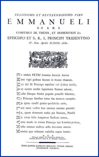 | Celsissimo et reverendissimo viro Emmanueli ex S.R.I. comitibus de Thunn, et Hohenstein &c. episcopo et S.R.I. principi Tridentino IV. non. aprilis M.DCCC. electo |