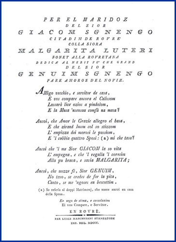| Per el maridoz del sior Giacom Sgnengo citadim de Rovré colla siora Malgarita Luteri sonet alla rovretana |