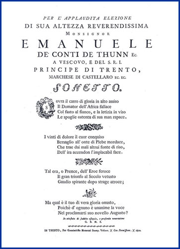 | Per l'applaudita elezione di sua altezza reverendissima monsignor Emanuele de' conti de Thunn ec. a vescovo, e del S.R.I. principe di Trento, marchese di Castellaro ec. ec. sonetto |
