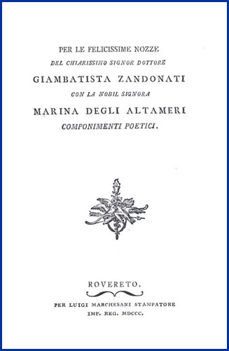 | Per le felicissime nozze del chiarissimo signor dottore Giambatista Zandonati con la nobil signora Marina degli Altameri componimenti poetici |