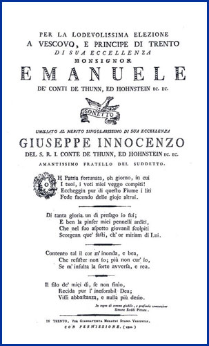 | Per la lodevolissima elezione a vescovo, e principe di Trento di sua eccellenza monsignor Emanuele de' conti de Thunn, ed Hohnstein ec. ec. sonetto |
