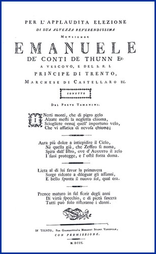 | Per l'applaudita elezione di sua altezza reverendissima monsignor Emanuele de' conti de Thunn ec. a vescovo, e del S.R.I. principe di Trento, marchese di Castellaro ec. sonetto |