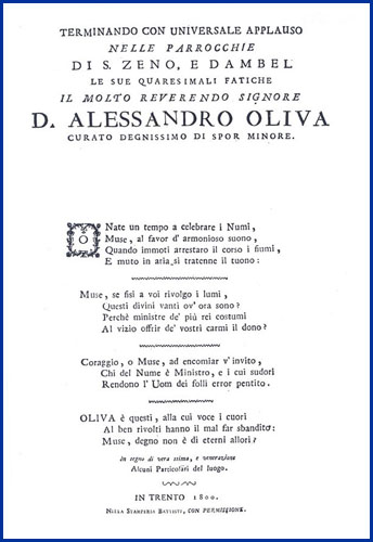 | Terminando con universale applauso nelle parrocchie di S. Zeno, e Dambel le sue quaresimali fatiche il molto reverendo signore d. Alessandro Oliva curato degnissimo di Spor Minore |