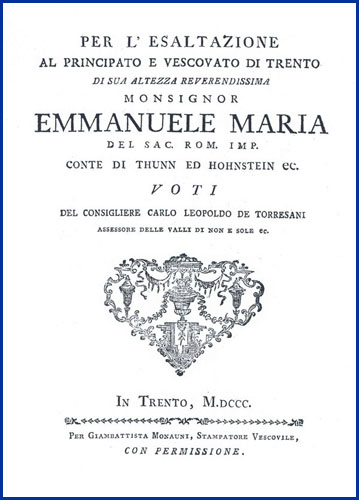 | Per l'esaltazione al principato e vescovato di Trento di sua altezza reverendissima monsignor Emmanuele Maria del Sac. Rom. Imp. conte di Thunn ed Hohnstein ec. voti |