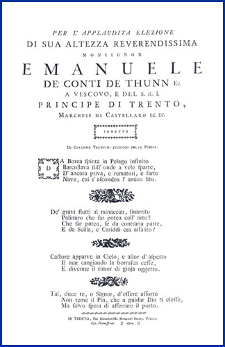 | Per l'applaudita elezione di sua altezza reverendissima monsignor Emanuele de' conti de Thunn ec. a vescovo, e del S.R.I. principe di Trento, marchese di Castellaro ec. ec. sonetto |