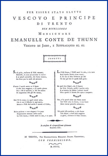 | Per essere stato eletto vescovo e principe di Trento sua eccellenza monsignore Emanuele conte de Thunn vescovo di Jasso, e suffraganeo ec. ec. sonetti |