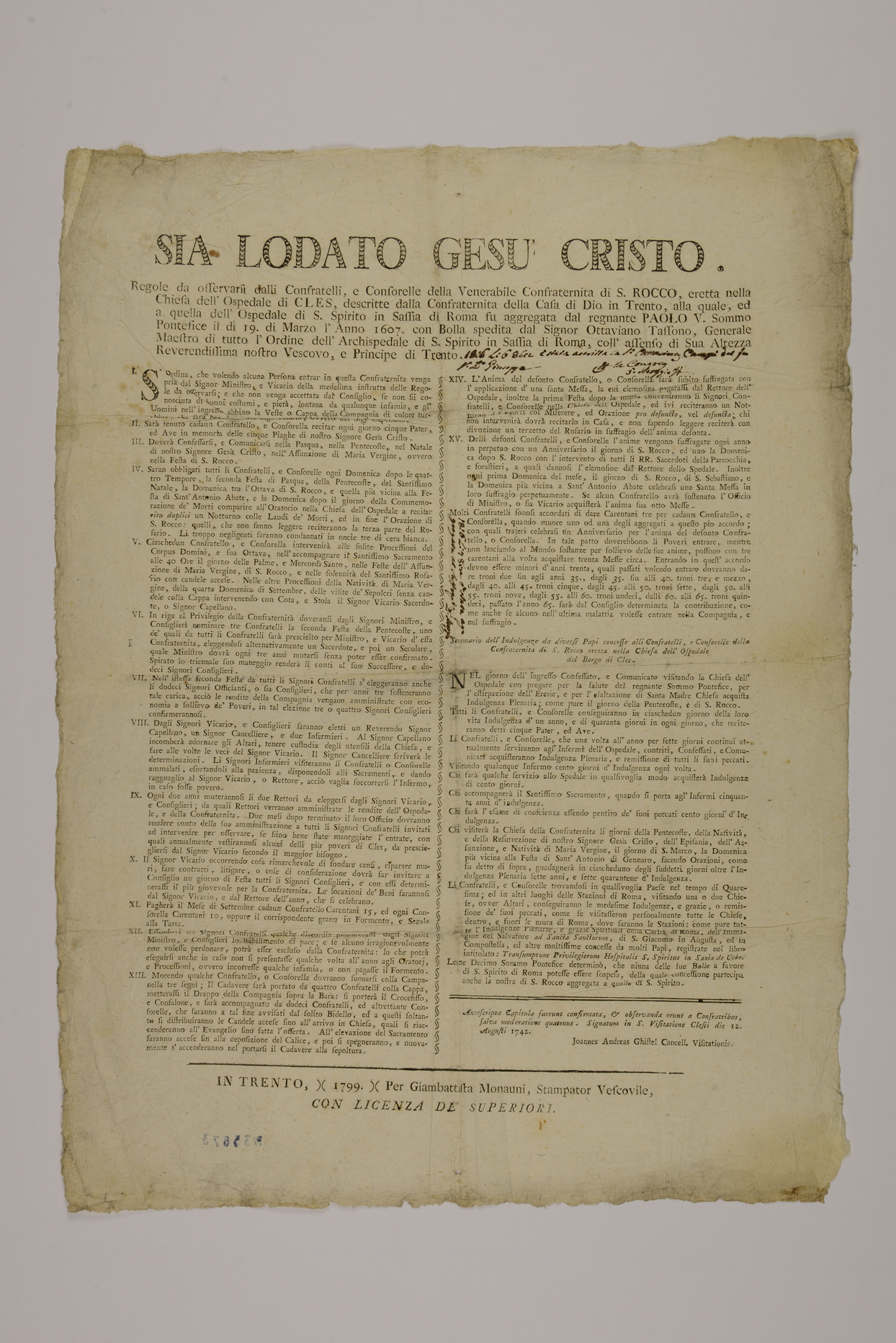 | Sia lodato Gesù Cristo. Regole da osservarsi dalli confratelli, e consorelle della venerabile Confraternita di S. Rocco, eretta nella chiesa dell'ospedale di Cles, descritte dalla Confraternita della Casa di Dio in Trento, alla quale, ed a quella dell'ospedale di S. Spirito in Sassia di Roma fu aggregata dal regnante Paolo V. sommo pontefice il dì 19. di marzo l'anno 1607. con bolla spedita dal signor Ottaviano Tassono, generale maestro di tutto l'ordine dell'Archispedale di S. Spirito in Sassia di Roma, coll'assenso di sua altezza reverendissima nostro vescovo, e principe di Trento |