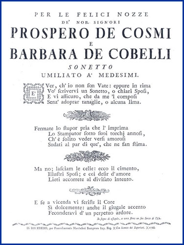 | Per le felici nozze de' nob. signori Prospero de Cosmi e Barbara de Cobelli sonetto umiliato a' medesimi |