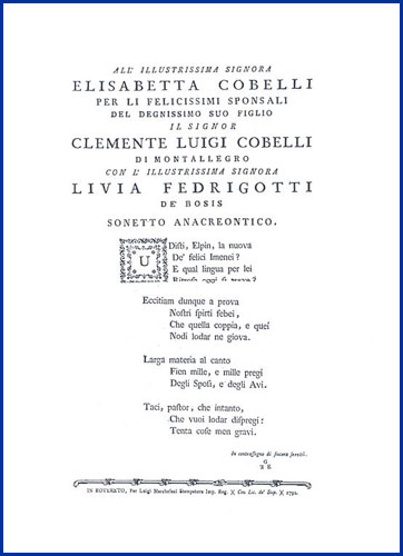| All'illustrissima signora Elisabetta Cobelli per li felicissimi sponsali del degnissimo suo figlio il signor Clemente Luigi Cobelli di Montallegro con l'illustrissima signora Livia Fedrigotti de' Bosis sonetto anacreontico |
