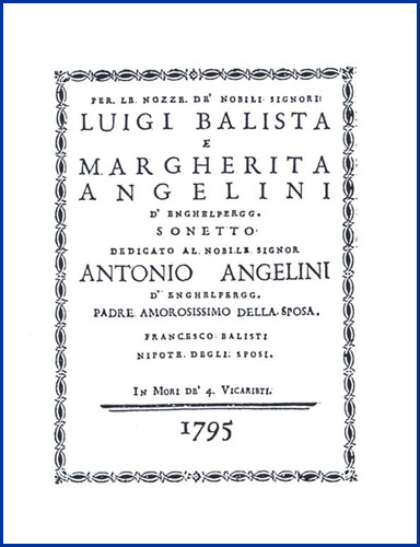 | Per le nozze de' nobili signori Luigi Balista e Margherita Angelini d'Enghelpergg. Sonetto dedicato al nobile signor Antonio Angelini d'Enghelpergg. Padre amorosissimo della sposa. Francesco Balisti nipote degli sposi |