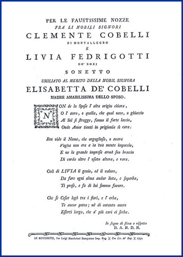 | Per le faustissime nozze fra li nobili signori Clemente Cobelli di Montallegro e Livia Fedrigotti de' Bosj sonetto umiliato al merito della nobil signora Elisabetta de' Cobelli madre amabilissima dello sposo |