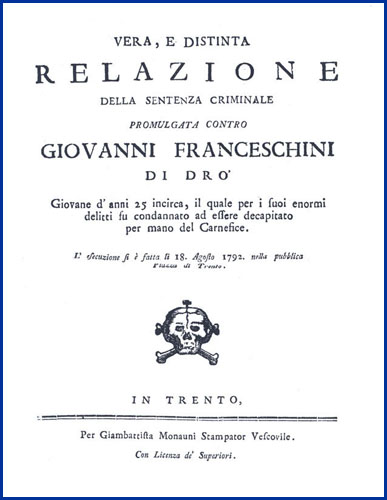 | Vera, e distinta relazione della sentenza criminale promulgata contro Giovanni Franceschini di Dro' giovane d'anni 25 incirca, il quale per i suoi enormi delitti fu condannato ad essere decapitato per mano del carnefice. L'esecuzione si è fatta li 18. agosto 1792. nella pubblica piazza di Trento |
