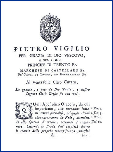 | Pietro Vigilio per grazia di Dio vescovo, e del S.R.I. principe di Trento ec. marchese di Castellaro ec. de' conti di Thunn, ed Hochenstein ec. al venerabile clero curato |