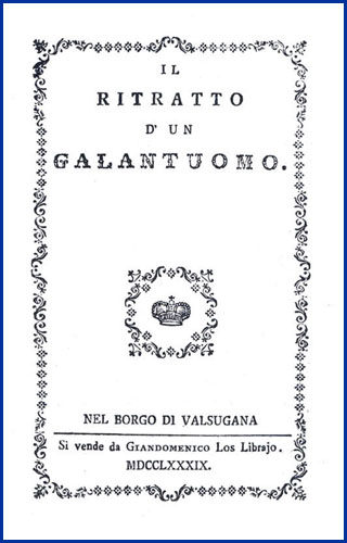 [8] p. Altro frontespizio in francese: Le portrait d'un honnete homme. Au Bourg de Valsugana on vend par Jean Dominique Los libraire, nel colophon: In Roveredo : per Francescantonio Marchesani stampat. imp. reg., 1789. Con licenza de' superiori