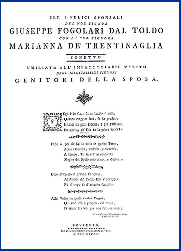 | Per i felici sponsali del nob. signor Giuseppe Fogolari Dal Toldo con la nob. signora Marianna de' Trentinaglia sonetto |