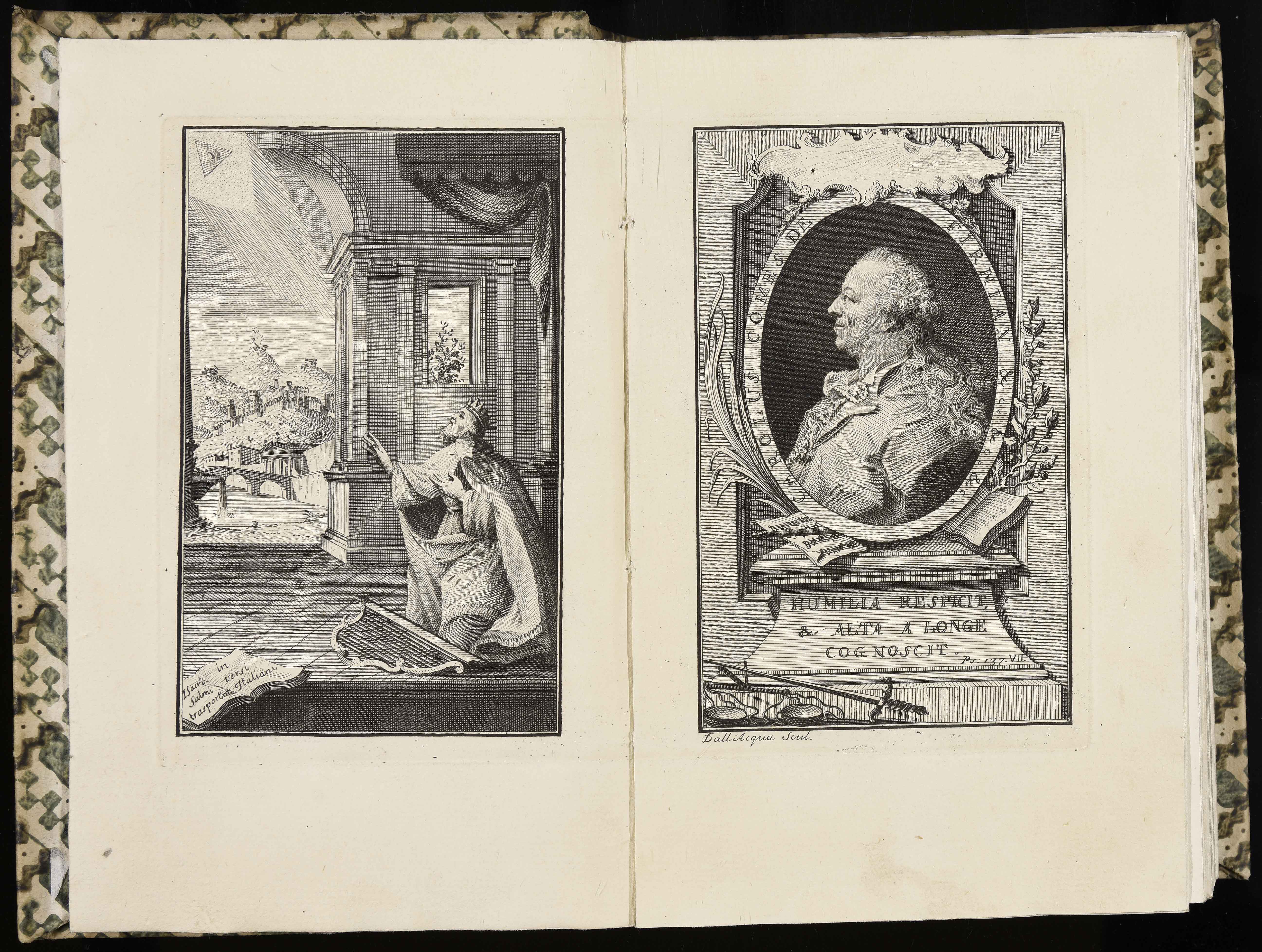 Calcografia; 146x93 mm; incisione di Cristoforo Dall’Acqua; in I sacri salmi trasportati in versi italiani da d. Valeriano Canati prete regolare vicentino, Vicenza, Carlo Bressan, 1770