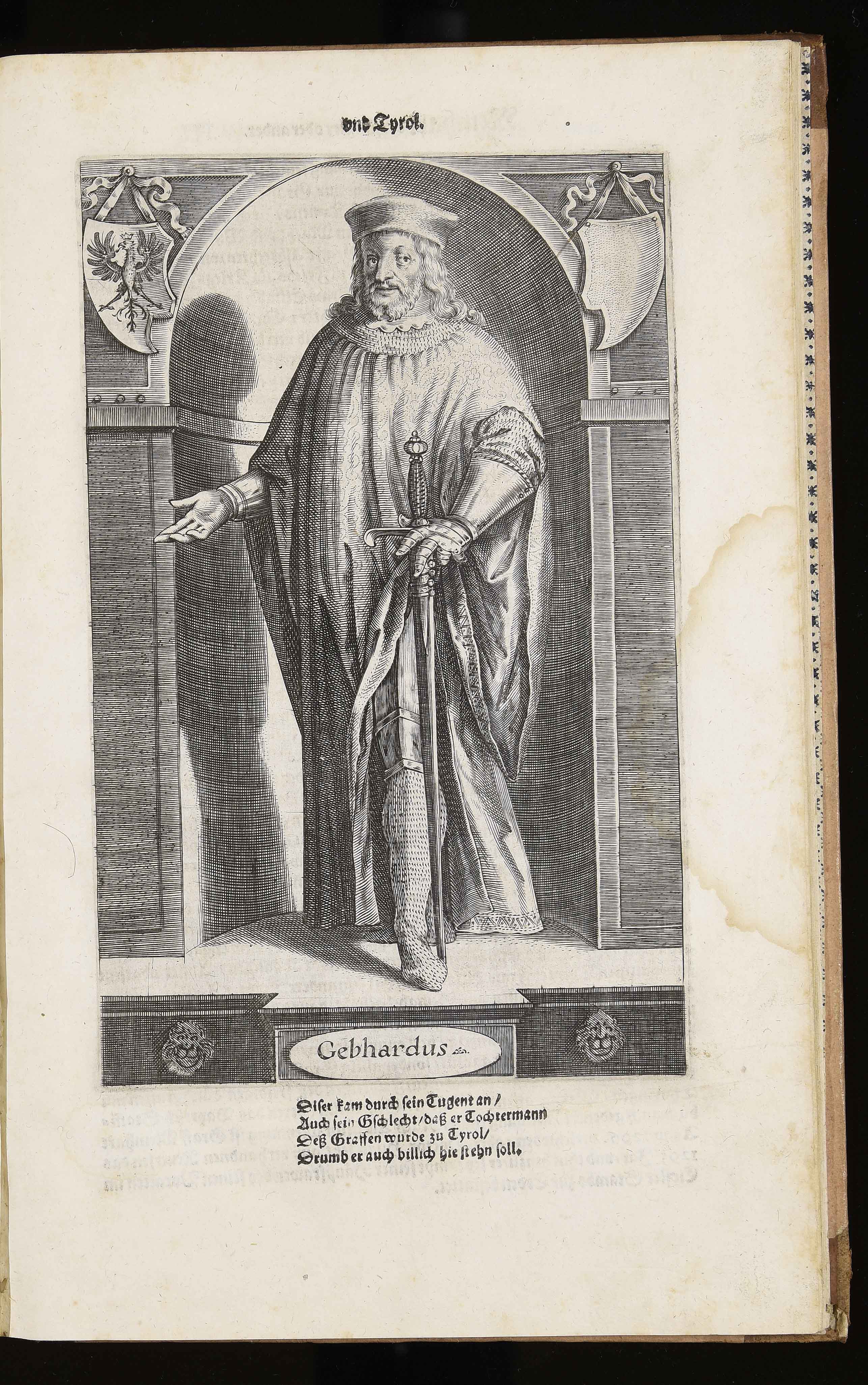 Calcografia; 219x140 mm; incisione di Wolfgang Kilian e di Dominik Custos; nome del secondo incisore dal confronto con l'edizione del 1599 in VD16 (http://bit.ly/2s2YpAE); in Markus Henning, Tirolensium principum comitum, der gefürsten Grafen zu Tyrol von anno 1229 biß anno 1623 eigentliche Contrafacturen …, Augsburg, Lukas Schultes, Wolfgang Kilian, 1623