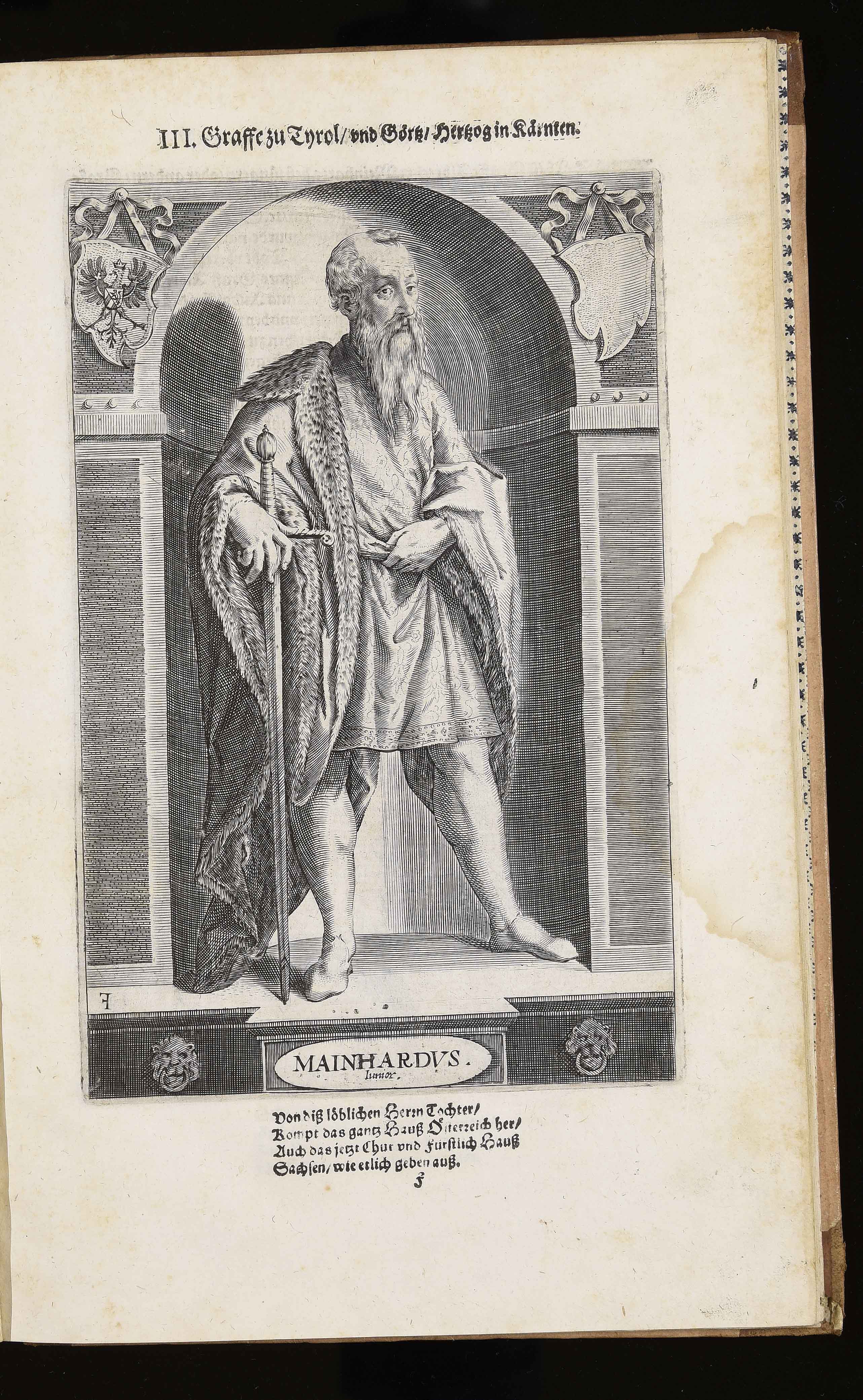 Calcografia; 215x143 mm; incisione di Wolfgang Kilian e di Dominik Custos; nome del secondo incisore dal confronto con l'edizione del 1599 in VD16 (http://bit.ly/2s2YpAE); in Markus Henning, Tirolensium principum comitum, der gefürsten Grafen zu Tyrol von anno 1229 biß anno 1623 eigentliche Contrafacturen …, Augsburg, Lukas Schultes, Wolfgang Kilian, 1623