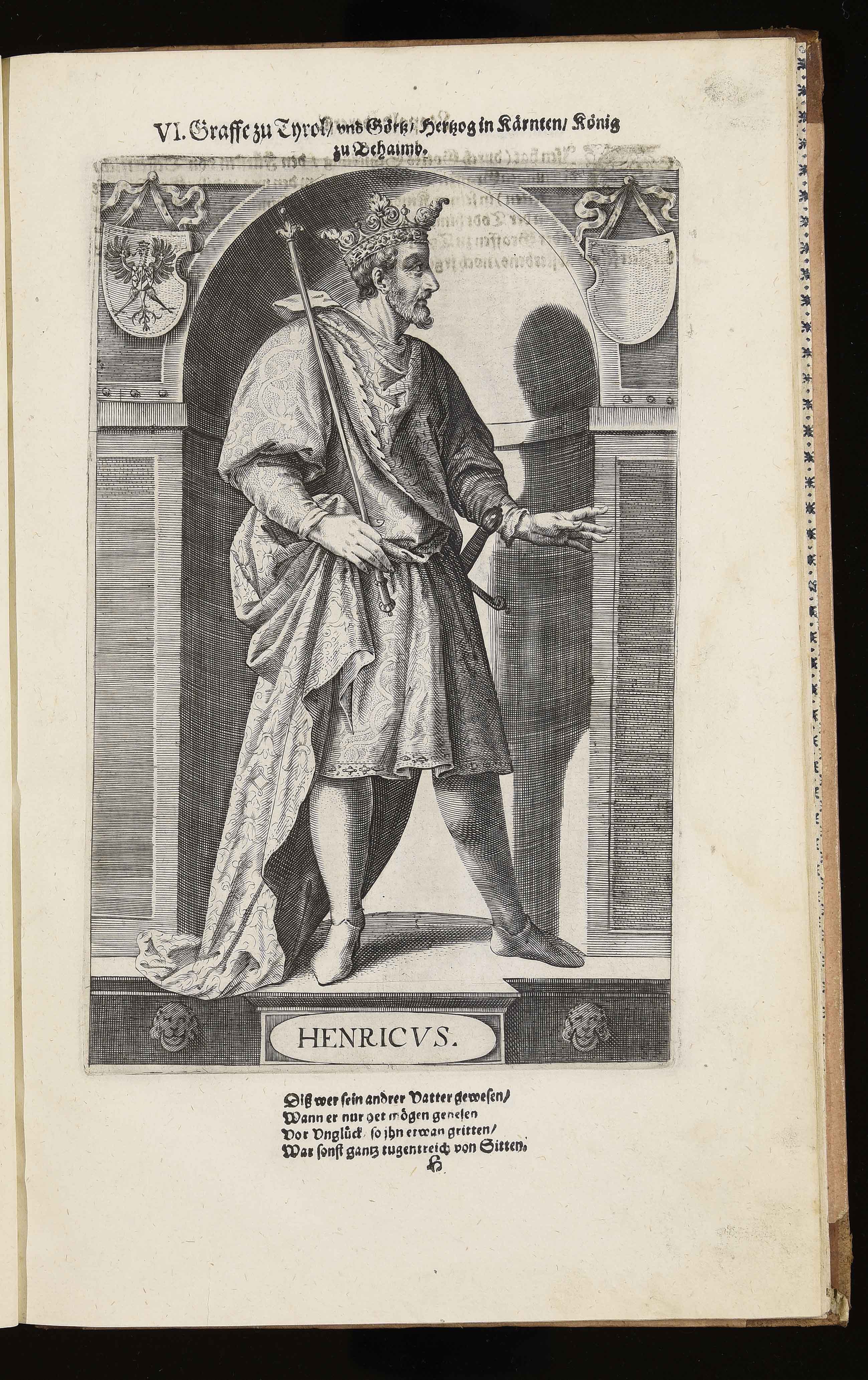 Calcografia; 215x142 mm; incisione di Wolfgang Kilian e di Dominik Custos; nome del secondo incisore dal confronto con l'edizione del 1599 in VD16 (http://bit.ly/2s2YpAE); in Markus Henning, Tirolensium principum comitum, der gefürsten Grafen zu Tyrol von anno 1229 biß anno 1623 eigentliche Contrafacturen …, Augsburg, Lukas Schultes, Wolfgang Kilian, 1623