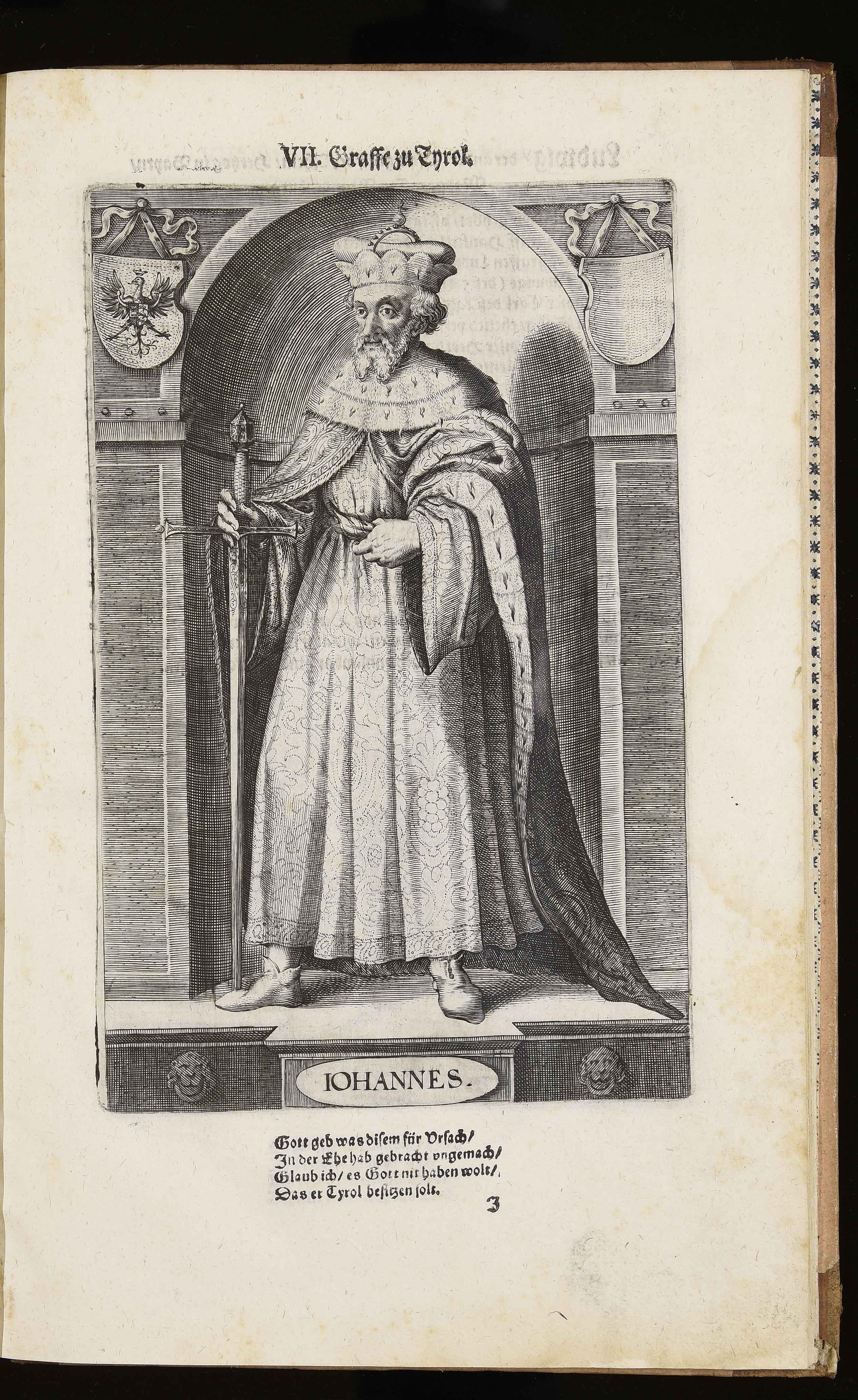 Calcografia; 216x140 mm; incisione di Wolfgang Kilian e di Dominik Custos; nome del secondo incisore dal confronto con l'edizione del 1599 in VD16 (http://bit.ly/2s2YpAE); in Markus Henning, Tirolensium principum comitum, der gefürsten Grafen zu Tyrol von anno 1229 biß anno 1623 eigentliche Contrafacturen …, Augsburg, Lukas Schultes, Wolfgang Kilian, 1623