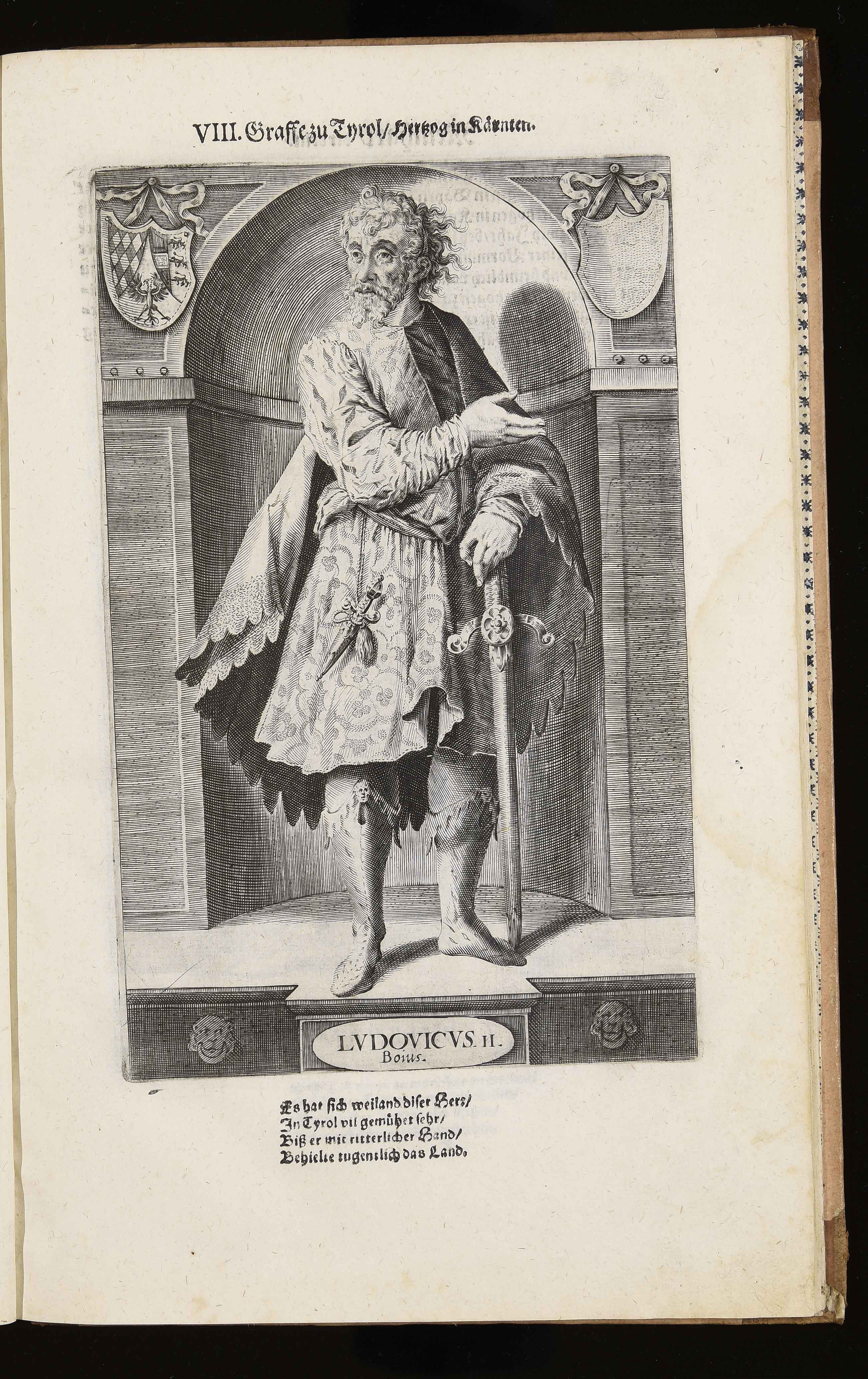 Calcografia; 216x139 mm; incisione di Wolfgang Kilian e di Dominik Custos; nome del secondo incisore dal confronto con l'edizione del 1599 in VD16 (http://bit.ly/2s2YpAE); in Markus Henning, Tirolensium principum comitum, der gefürsten Grafen zu Tyrol von anno 1229 biß anno 1623 eigentliche Contrafacturen …, Augsburg, Lukas Schultes, Wolfgang Kilian, 1623