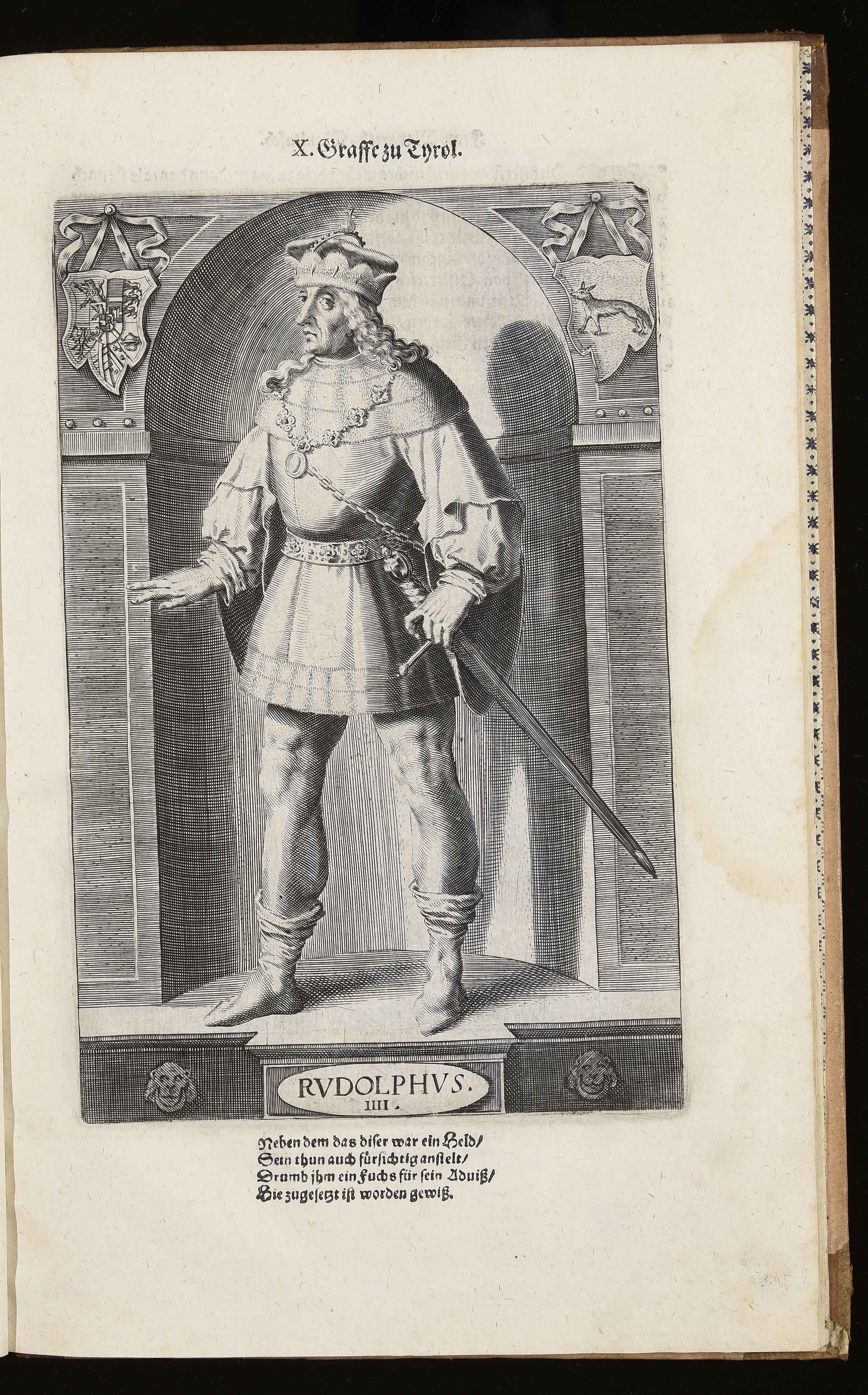 Calcografia; 217x143 mm; incisione di Wolfgang Kilian e di Dominik Custos; nome del secondo incisore dal confronto con l'edizione del 1599 in VD16 (http://bit.ly/2s2YpAE); in Markus Henning, Tirolensium principum comitum, der gefürsten Grafen zu Tyrol von anno 1229 biß anno 1623 eigentliche Contrafacturen …, Augsburg, Lukas Schultes, Wolfgang Kilian, 1623