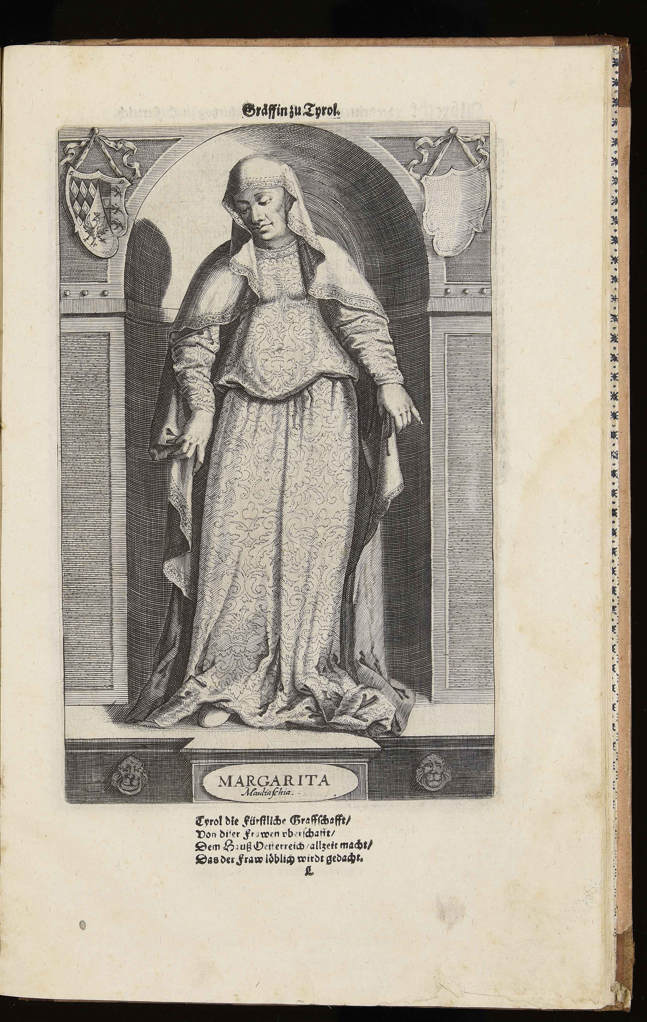 Calcografia; 215x137 mm; incisione di Wolfgang Kilian e di Dominik Custos; nome del secondo incisore dal confronto con l'edizione del 1599 in VD16 (http://bit.ly/2s2YpAE); in Markus Henning, Tirolensium principum comitum, der gefürsten Grafen zu Tyrol von anno 1229 biß anno 1623 eigentliche Contrafacturen …, Augsburg, Lukas Schultes, Wolfgang Kilian, 1623