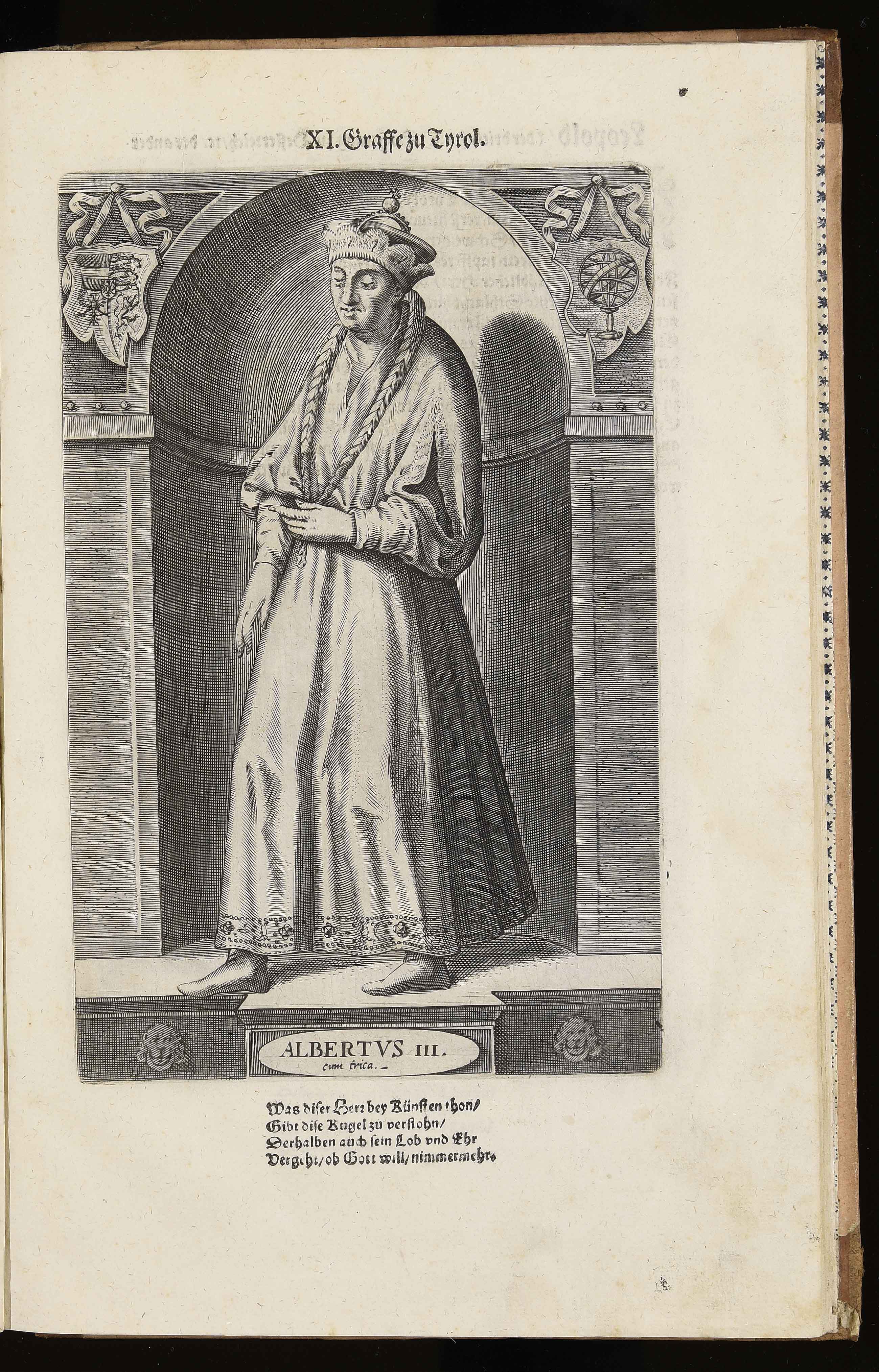 Calcografia; 214x139 mm; incisione di Wolfgang Kilian e di Dominik Custos; nome del secondo incisore dal confronto con l'edizione del 1599 in VD16 (http://bit.ly/2s2YpAE); in Markus Henning, Tirolensium principum comitum, der gefürsten Grafen zu Tyrol von anno 1229 biß anno 1623 eigentliche Contrafacturen …, Augsburg, Lukas Schultes, Wolfgang Kilian, 1623