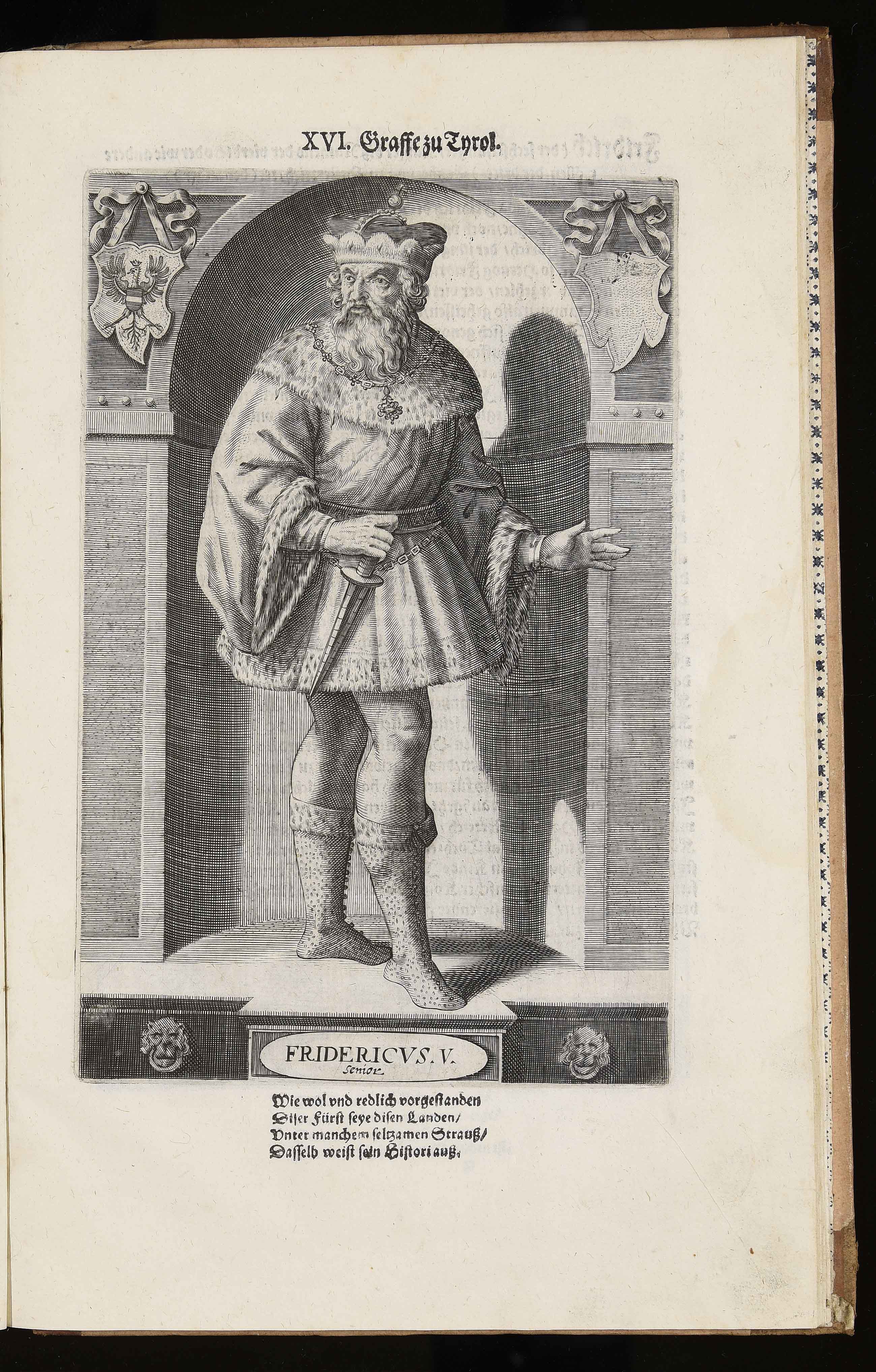 Calcografia; 217x142 mm; incisione di Wolfgang Kilian e di Dominik Custos; nome del secondo incisore dal confronto con l'edizione del 1599 in VD16 (http://bit.ly/2s2YpAE); in Markus Henning, Tirolensium principum comitum, der gefürsten Grafen zu Tyrol von anno 1229 biß anno 1623 eigentliche Contrafacturen …, Augsburg, Lukas Schultes, Wolfgang Kilian, 1623