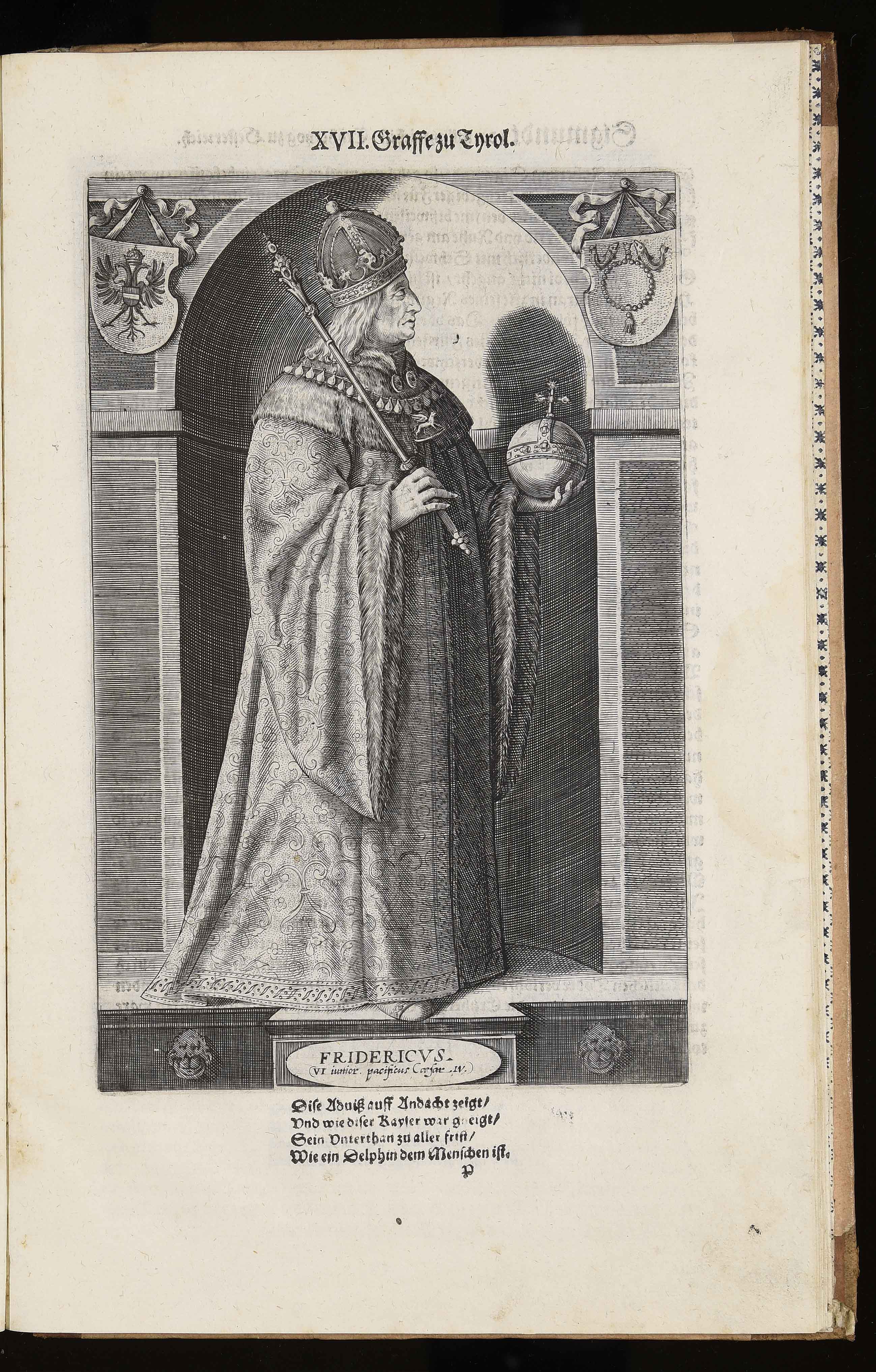Calcografia; 217x140 mm; incisione di Wolfgang Kilian e di Dominik Custos; nome del secondo incisore dal confronto con l'edizione del 1599 in VD16 (http://bit.ly/2s2YpAE); in Markus Henning, Tirolensium principum comitum, der gefürsten Grafen zu Tyrol von anno 1229 biß anno 1623 eigentliche Contrafacturen …, Augsburg, Lukas Schultes, Wolfgang Kilian, 1623