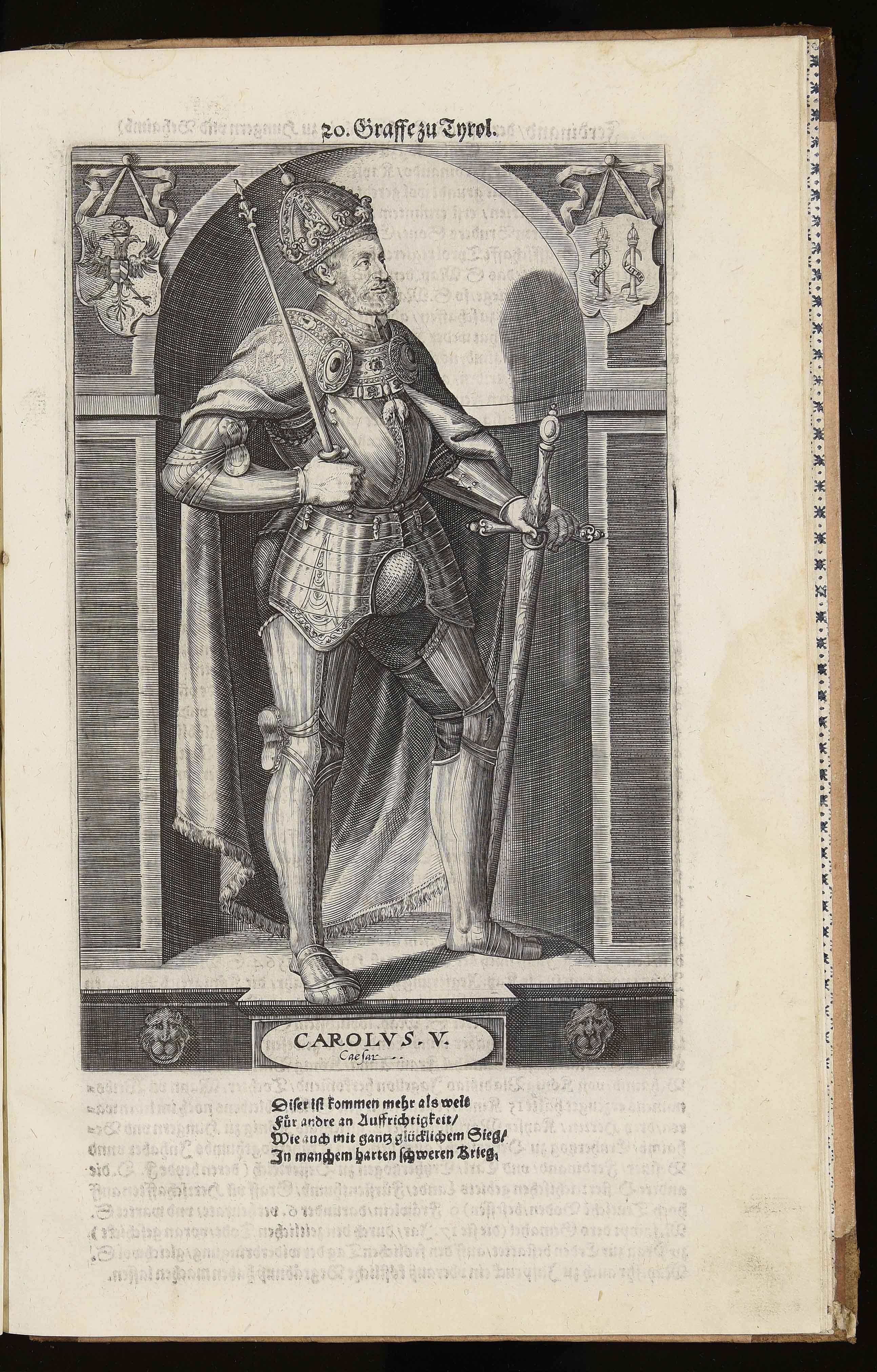 Calcografia; 217x142 mm; incisione di Wolfgang Kilian e di Dominik Custos; nome del secondo incisore dal confronto con l'edizione del 1599 in VD16 (http://bit.ly/2s2YpAE); in Markus Henning, Tirolensium principum comitum, der gefürsten Grafen zu Tyrol von anno 1229 biß anno 1623 eigentliche Contrafacturen …, Augsburg, Lukas Schultes, Wolfgang Kilian, 1623