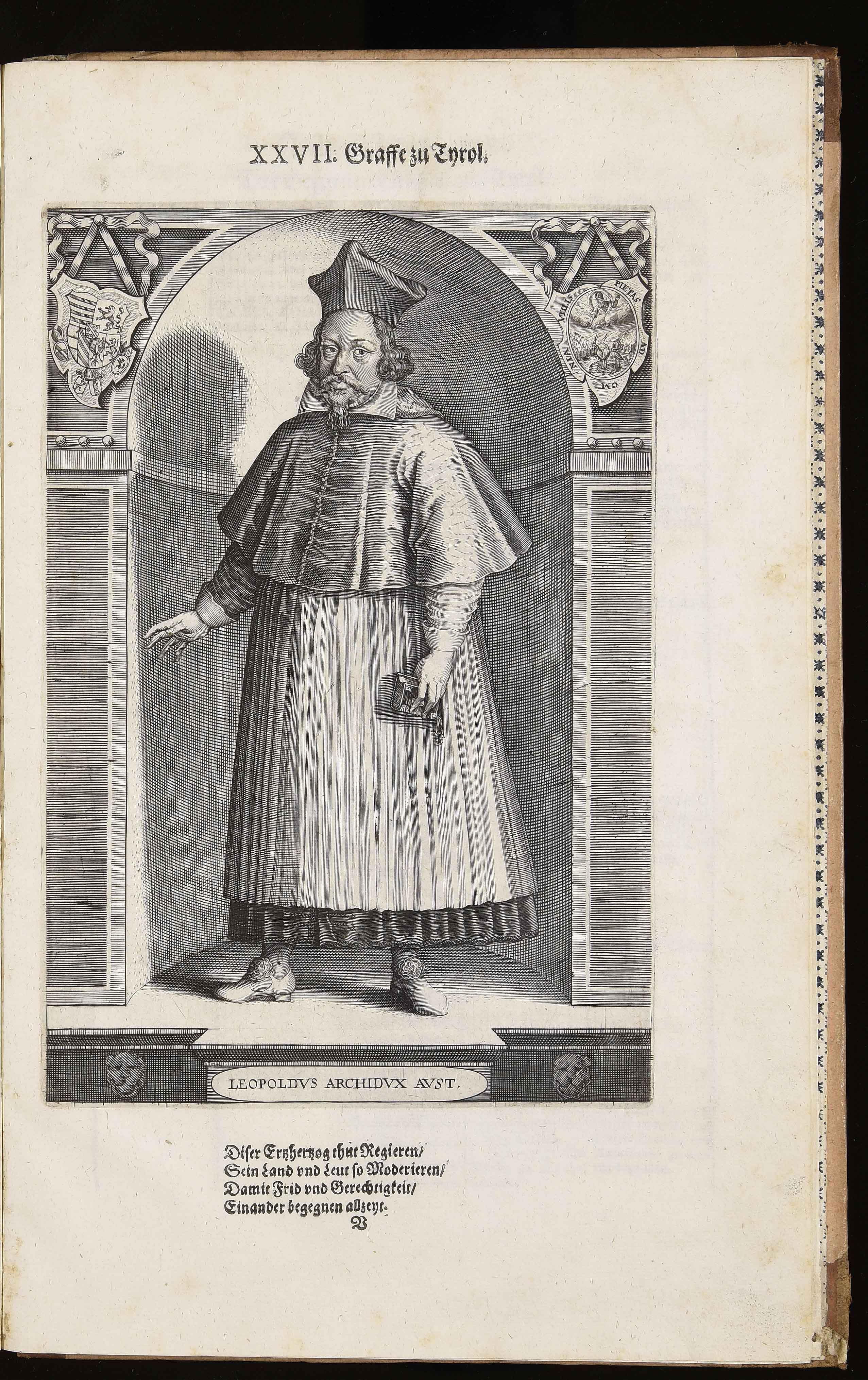 Calcografia; 211x143 mm; incisione di Wolfgang Kilian e di Dominik Custos; nome del secondo incisore dal confronto con l'edizione del 1599 in VD16 (http://bit.ly/2s2YpAE); in Markus Henning, Tirolensium principum comitum, der gefürsten Grafen zu Tyrol von anno 1229 biß anno 1623 eigentliche Contrafacturen …, Augsburg, Lukas Schultes, Wolfgang Kilian, 1623