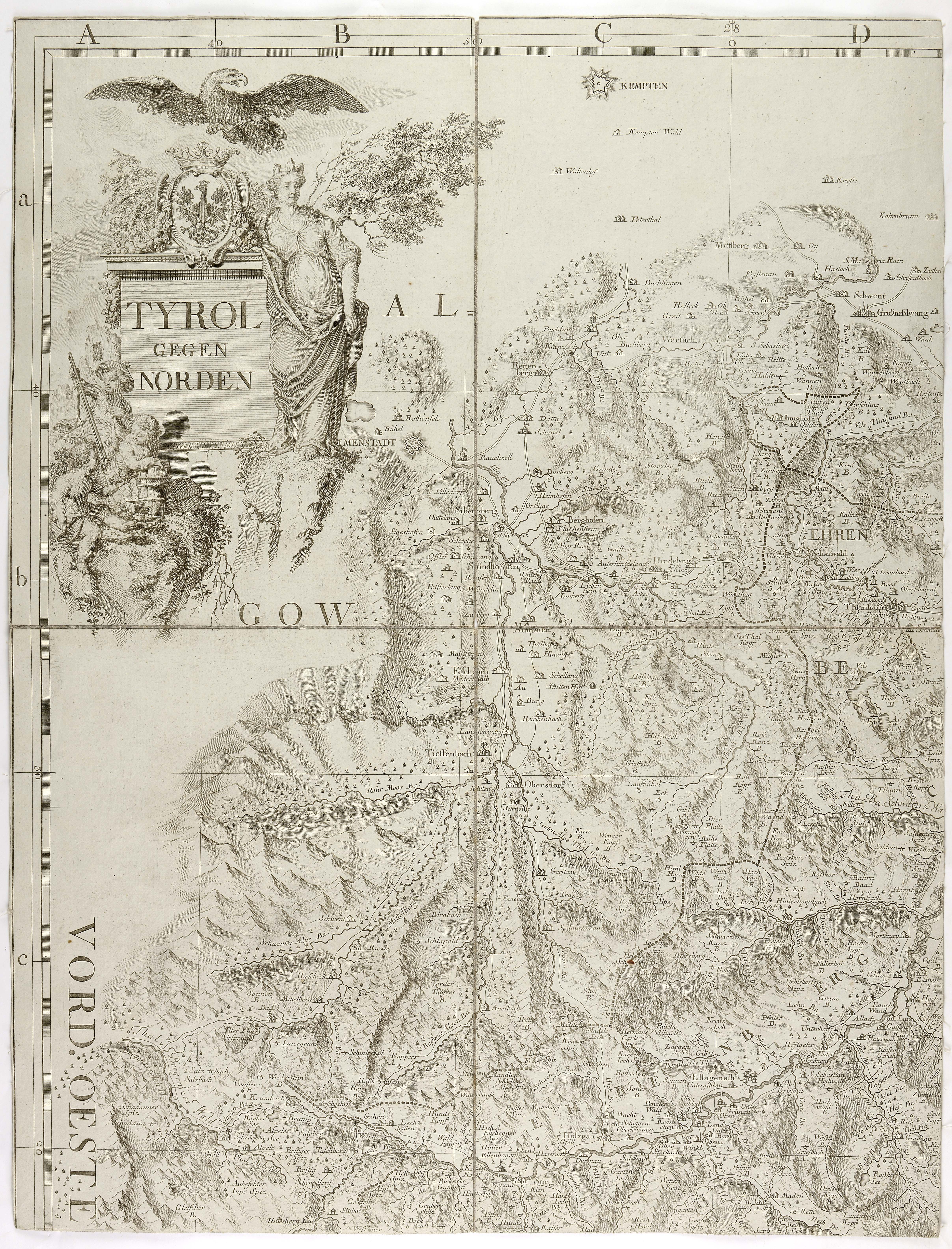 | Atlas Tyrolensis. Tyrolis sub felici regimine Mariae Theresiae Rom. Imper. Aug. chorographice delineata a Petro Anich et Blasio Hueber colonis oberperfussianis curante Ignat. Weinhart profess. math. in Univers. Oenipontana aeri incisa a Joa. Ernest Mansfeld |
