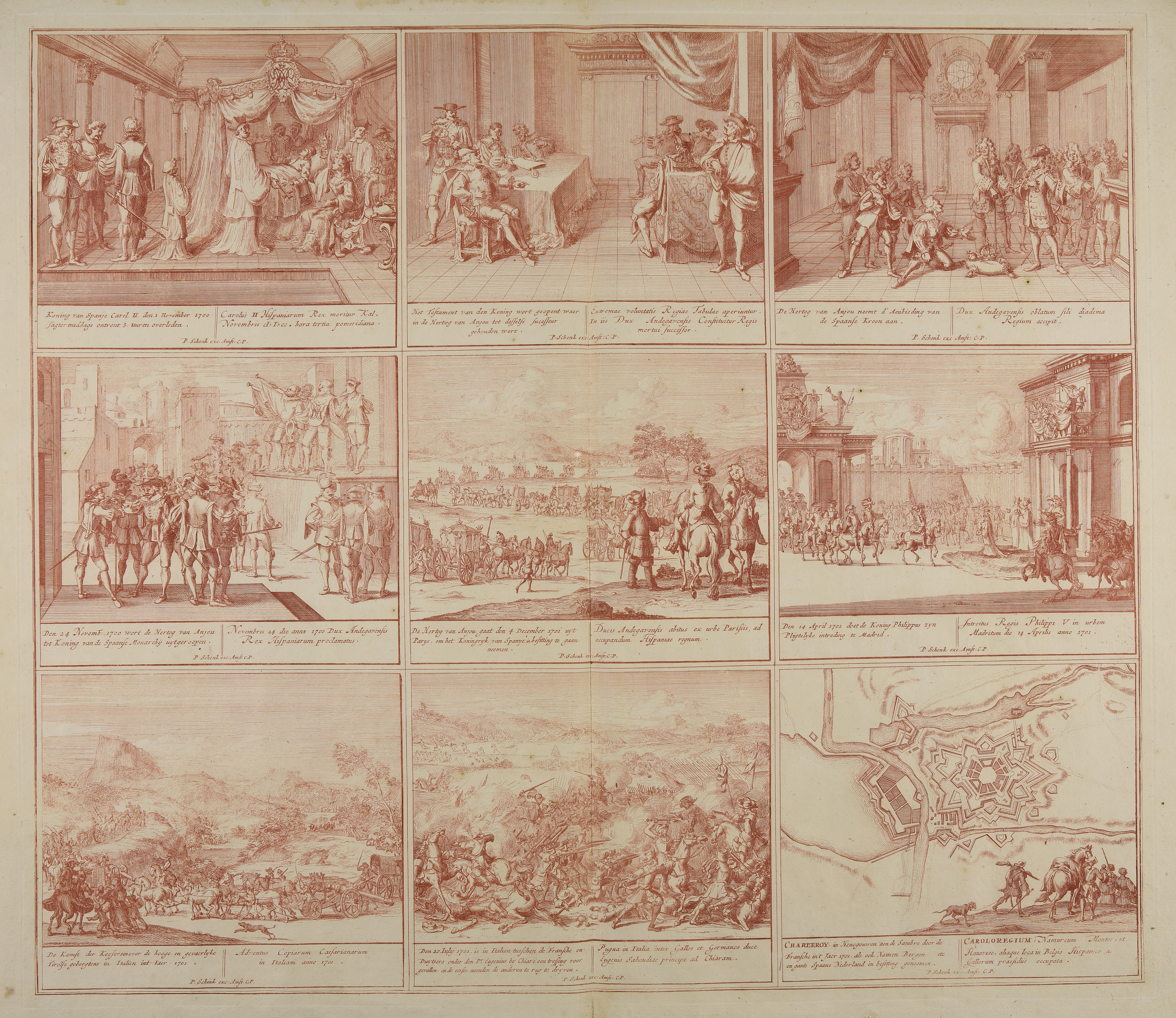 | Schouwburg van den Oorlog beginnende van koning Karel den II tot op koning Karel den III ... = Theatrum bellicum incipiens a Carolo II hispaniarum rege ad Carolum III ..., Tav. 1 |