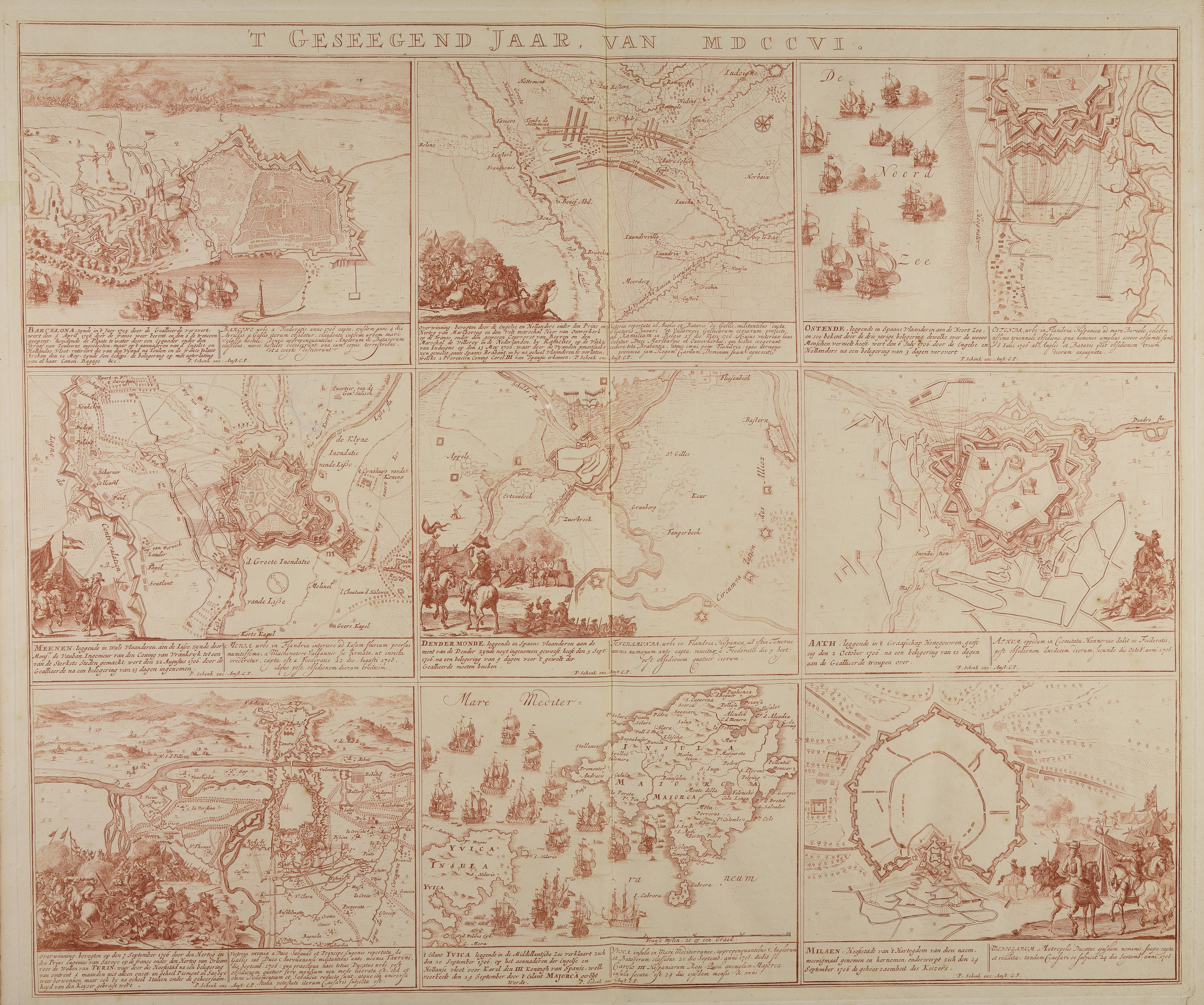Calcografia; 500x590 mm; pubblicata in Schouwburg van den Oorlog ..., Amsterdam, Peter Schenk, 1706,1707,1709 (Cfr. Cornelis Koeman, Atlantes neerlandici, Amsterdam, Theatrum orbis terrarum, 1967-1971, vol. 3, p. 116)