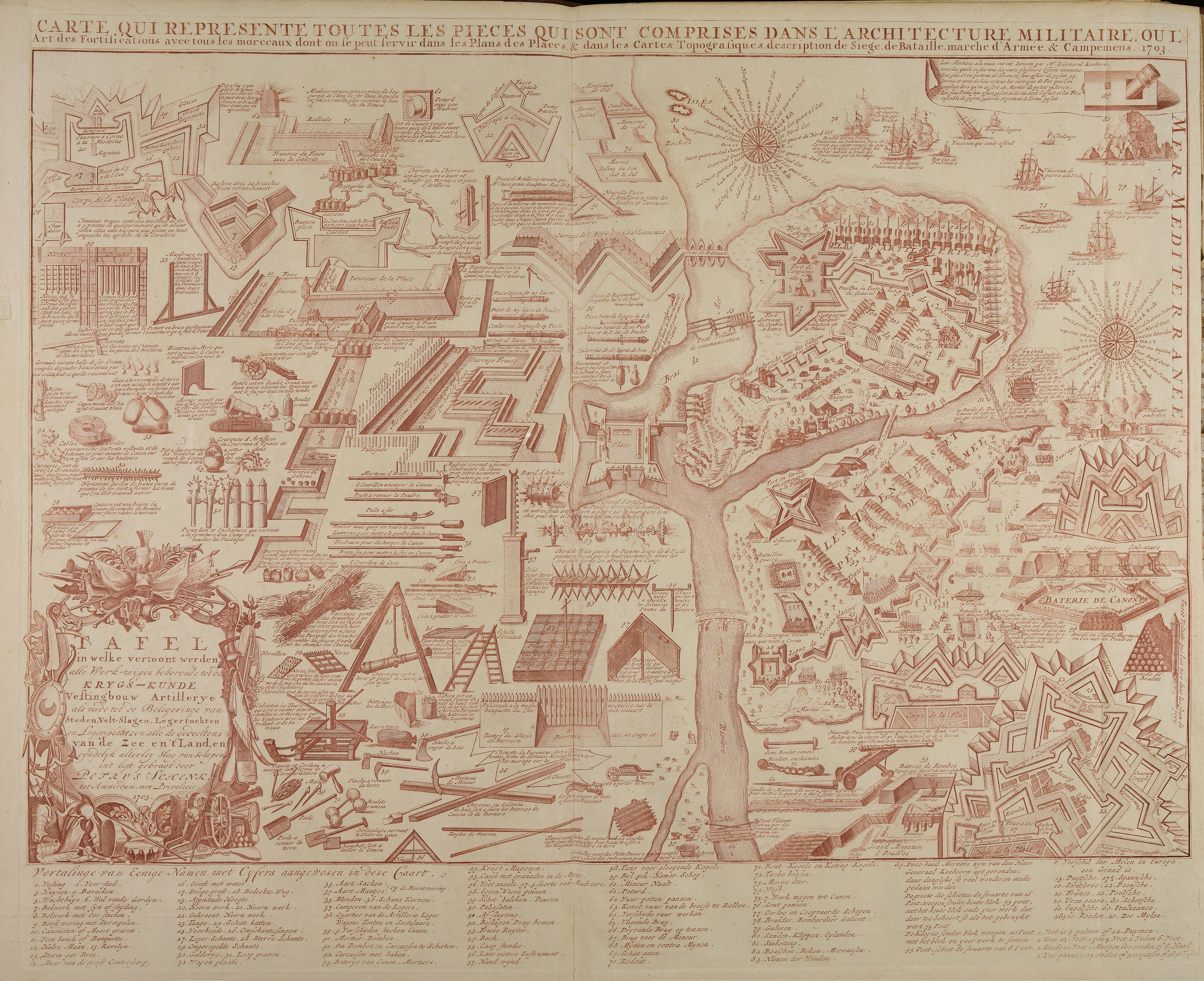 | Tafel in welke vertoont werden alle werk-tuygen behorende tot de Krygs-Kunde Vestingbouw artillerye ... = Carte qui represente toutes les pieces qui sont comprises dans l'architecture militaire ou l'art des fortifications avec tous les morceaux dont on se |