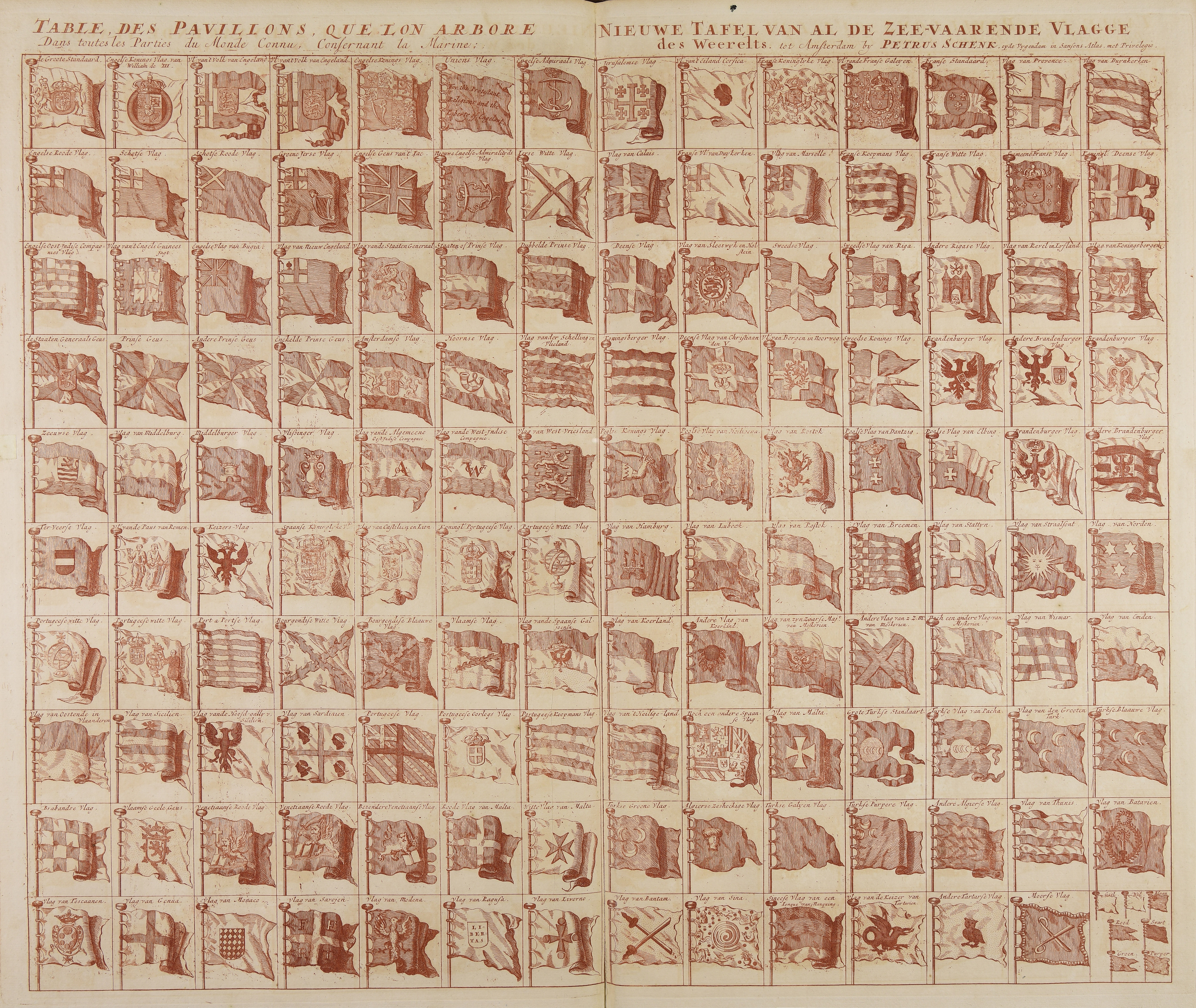 | Table des pavillons que l'on arbore dans toutes les parties du monde connu, consernant la marine = Nieuwe Tafel van al de zee-vaarende vlagge des weerelts |