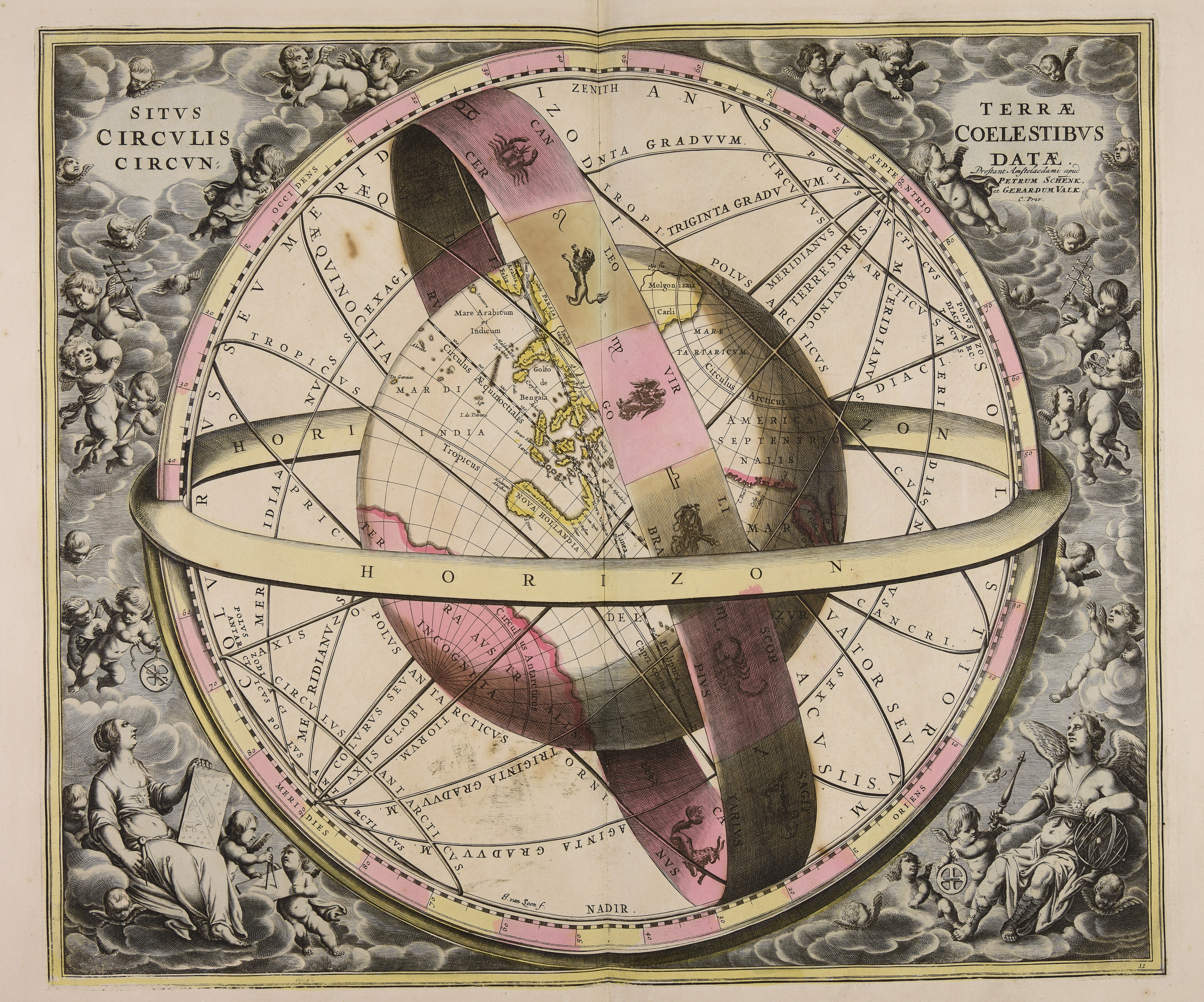 Calcografia; 412x484 mm; pubblicata in Andreas Cellarius, Harmonia macrocosmica seu Atlas universalis et novus..., Amsterdam, Valk e Schenk, 1708; (Cfr. Peter van der Krogt, Koeman's atlantes neerlandici, 't Goy-Houten, HES, 1997, vol. 1, pp. 517-518)