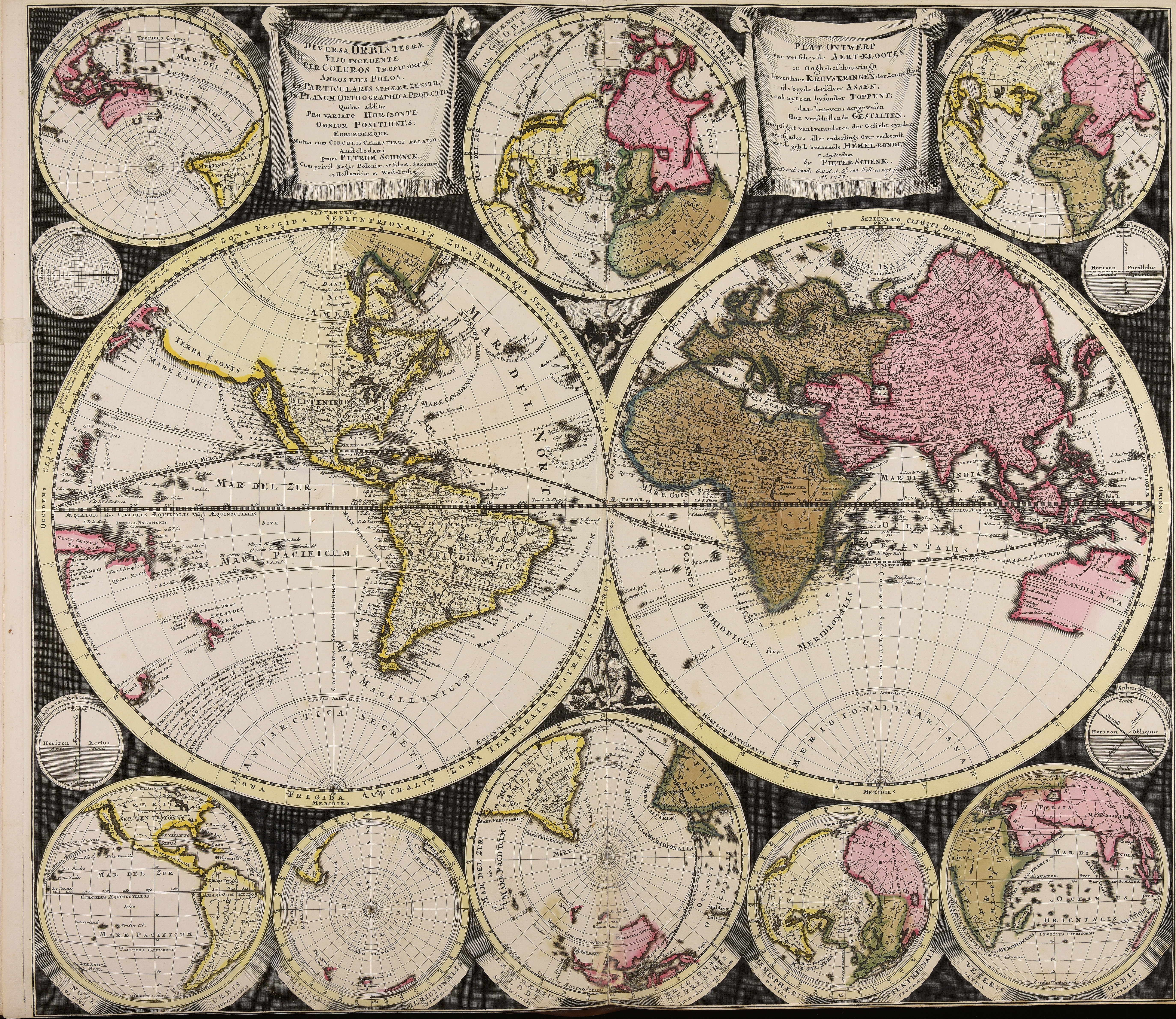| Diversa orbis Terrae visu incedente per coluros Tropicorum ambos ejus polos et particularis sphaerae zenith in planum orthographica projectio quibus additae pro variato horizonte omnium positiones eorumdemque mutua cum circulis caelestibus relatio = Plat Ontwerp van verscheyde Aert-klooten, in Oogh-beschouwingh soo bovenhare Kruyskringen der Zonne-standen als beyde derselver Assen, en ook uyten bysonder toppunt daar benevens aengewesen Hun verschillende Gestalten In opsight van't veranderen der Gesicht eynders mitsgaders aller onderlinge Over eenkomst Met de gelyk benaamde hemel-Ronden |