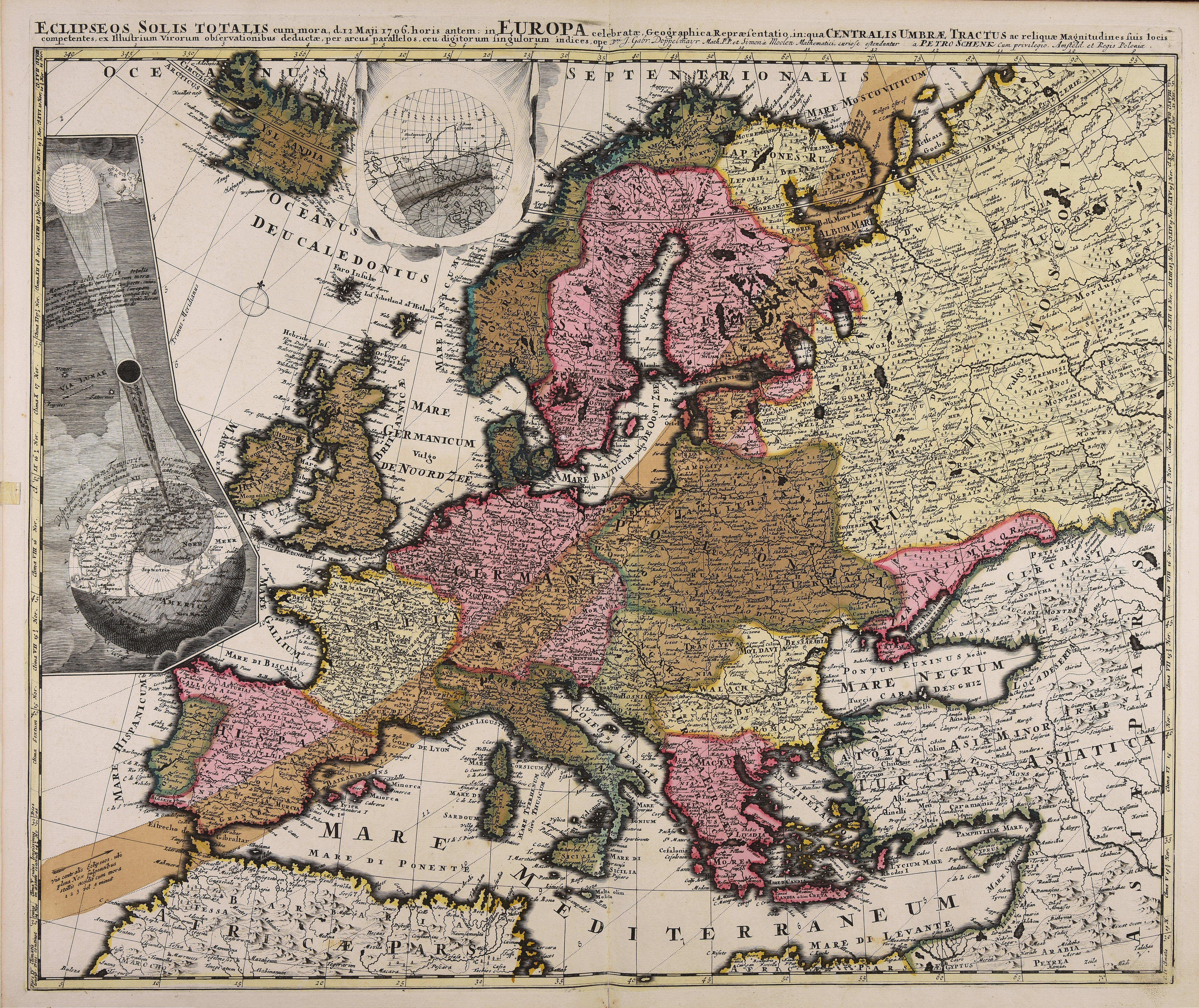 | Eclipseos Solis totalis cum mora d. 12 Maji 1706 horis antem in Europa celebratae geographica repraesentatio, in qua centralis umbrae tractus ac reliquae magnitudines suis locis competentes, ex illustrium virorum observationibus deductae per arcus parallelos c |