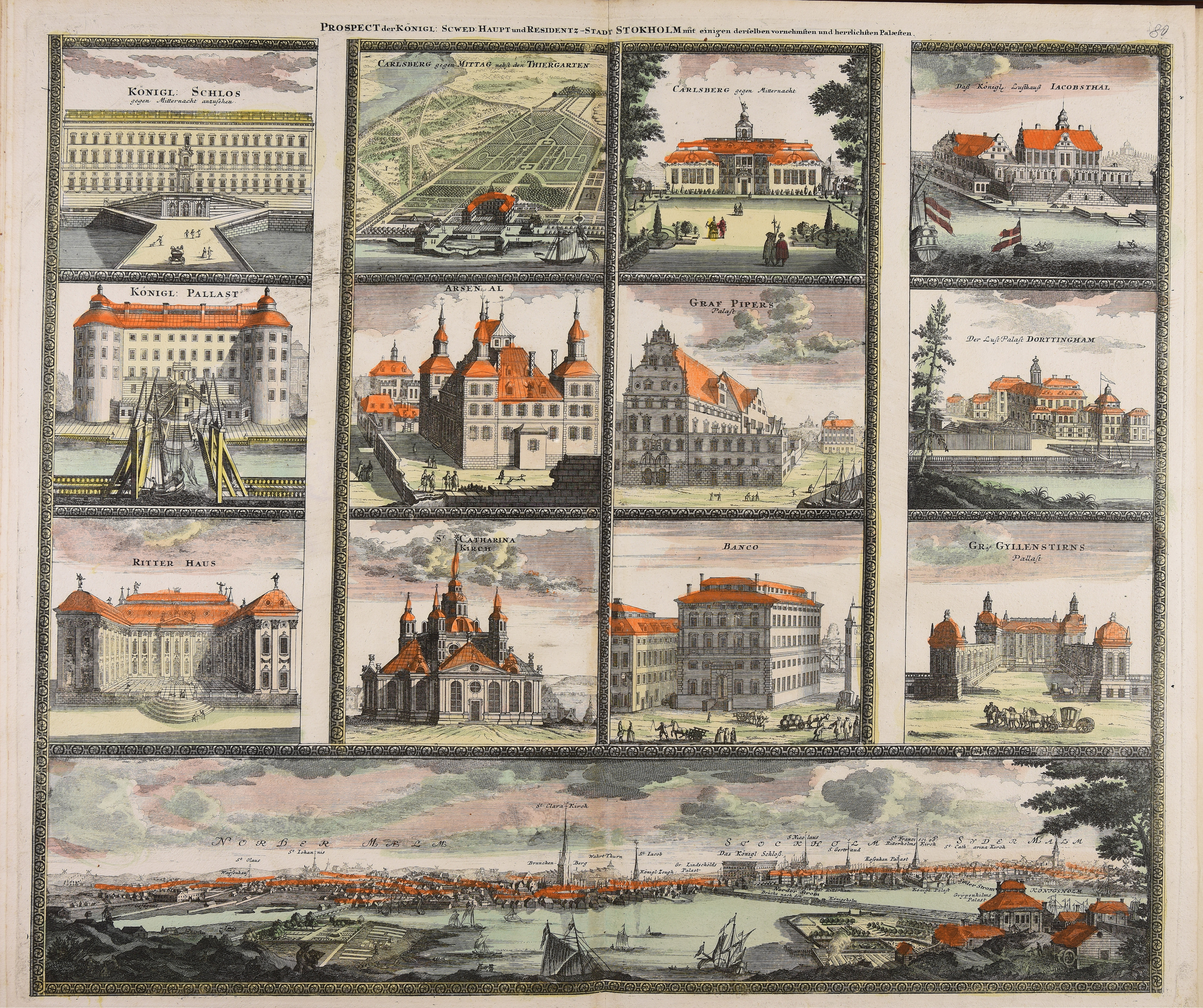 | Prospect der königl. scwed. Haupt und Residentz-Stadt Stokholm mit einigen derselben vornehmsten und herrlichsten Palaesten |